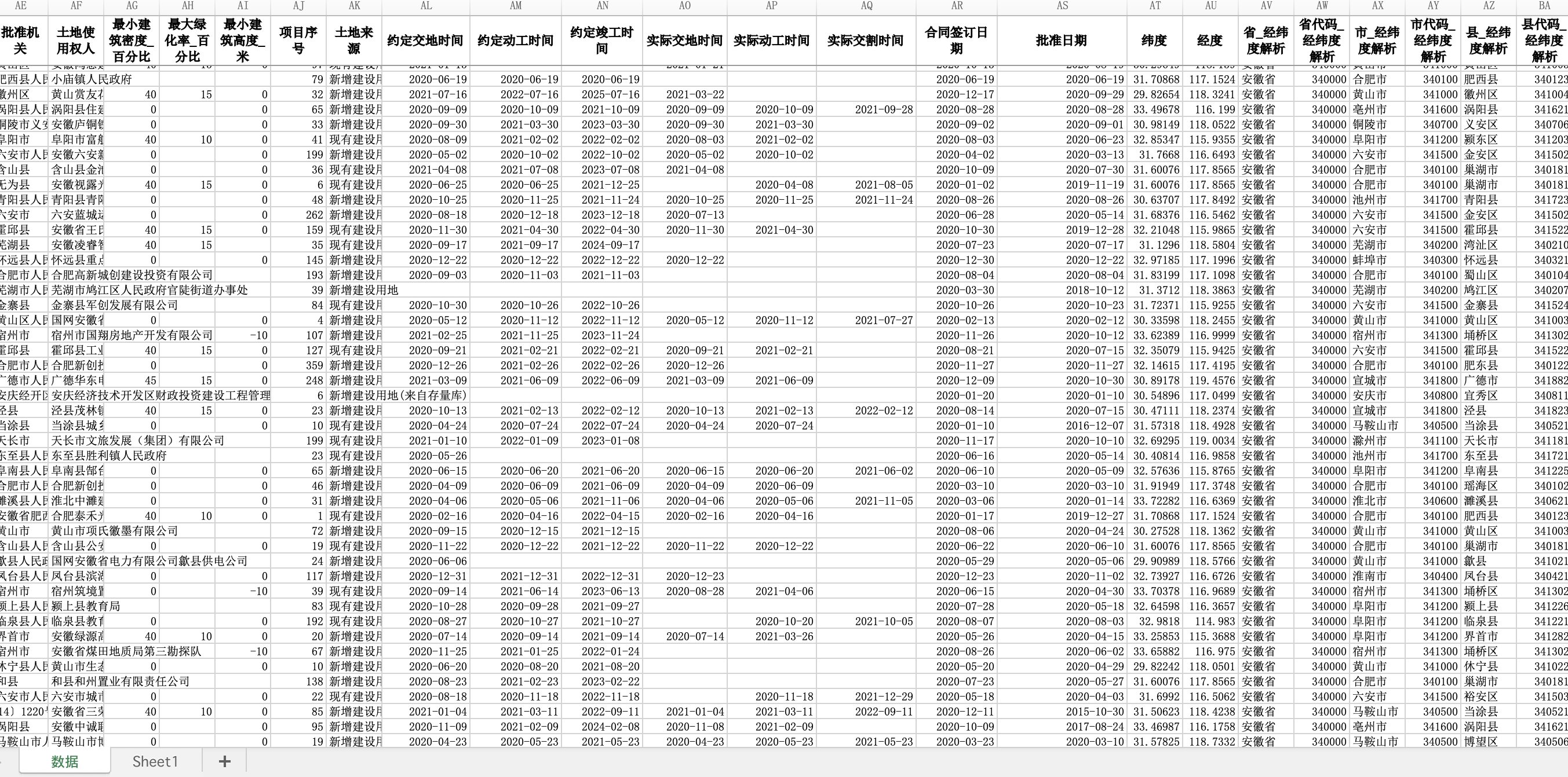 完整字段包括:年份、最小绿化率_百分比、供地全局唯一标志符、最大建筑高度_米、宗地全局唯一标志符、批准文号、省、批准机关、省代码、土地使用权人、市、最小建筑密度_百分比、市代码、最大绿化率_百分比、县、最小建筑高度_米、县代码、项目序号、行政区划代码、土地来源、编号、约定交地时间、电子监管号、约定动工时间、项目名称、约定竣工时间、行业分类、实际交地时间、土地级别、实际动工时间、宗地编号、实际交割时间、土地坐落、合同签订日期、供地方式、批准日期、供地面积_公顷、纬度、土地用途、经度、出让年限、省_经纬度解析、成交价格_万元、省代码_经纬度解析、投资强度_万元每公顷、建筑面积_公顷、市_经纬度解析、市代码_经纬度解析、最大建筑密度_百分比、县_经纬度解析、县代码_经纬度解析、最小容积率、最大容积率。