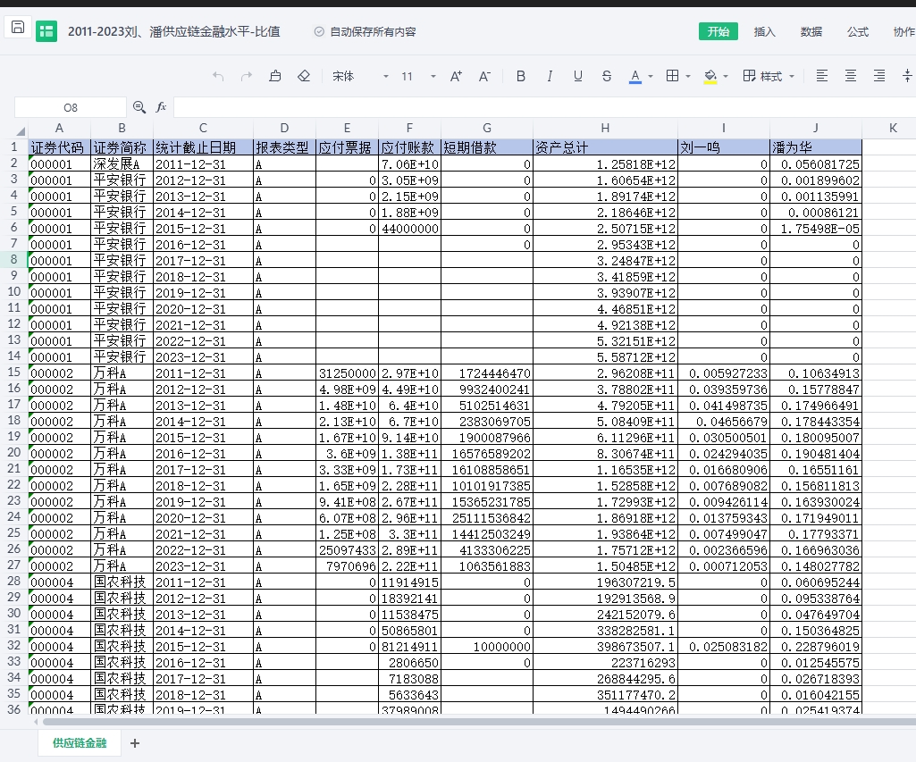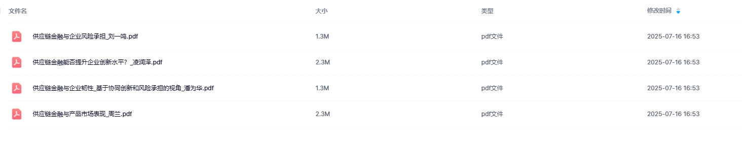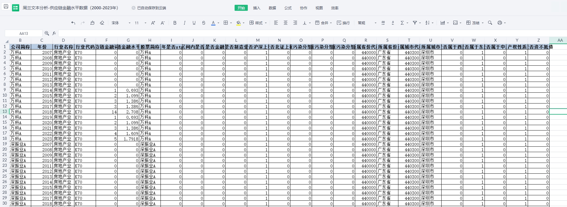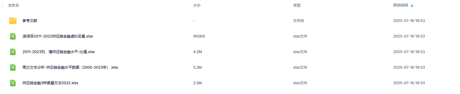 数据简介:企业供应链金融水平是指企业在供应链金融领域所具备的综合能力与表现,包括其利用金融工具优化供应链资金流、提升供应链整体效率、降低运营成本及风险的能力。本数据参考了四篇顶刊对供应链金融水平的四种测度方式,根据顶刊用到的关键词词频统计分析方法,度量企业供应链金融水平。