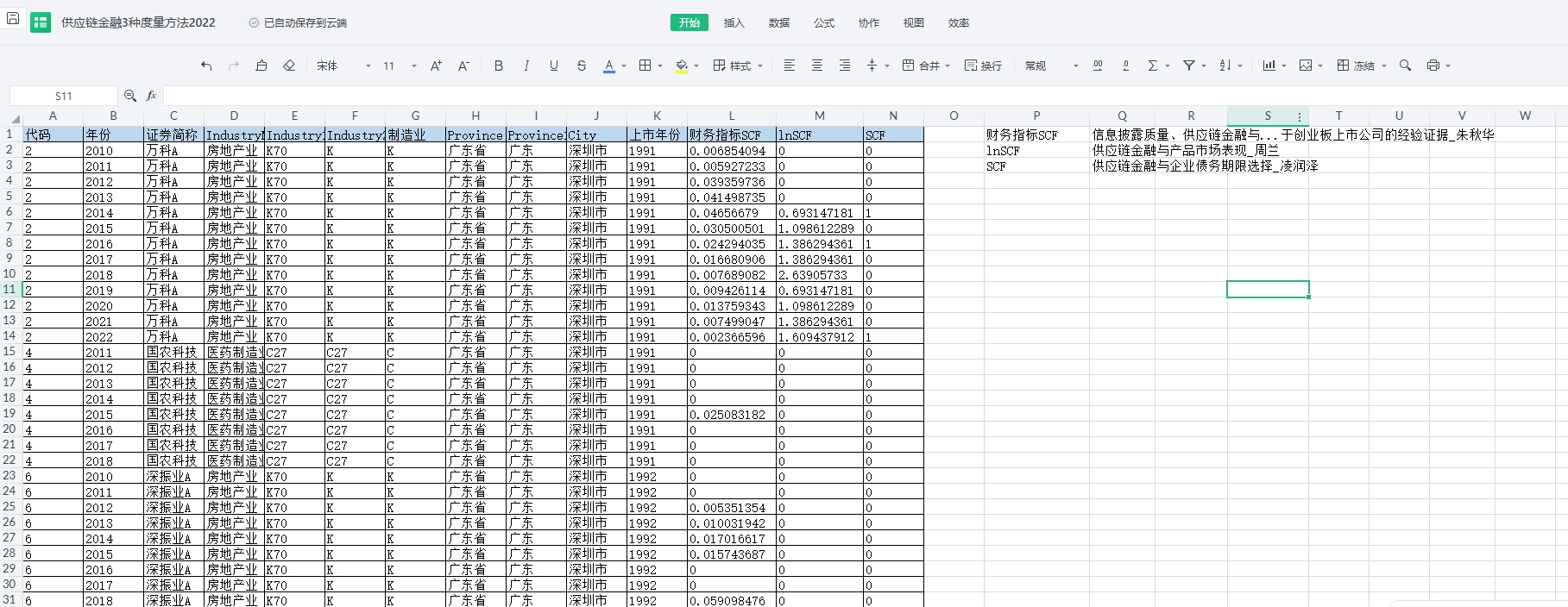 代码 年份 证券简称 IndustryName Industry1 Industry2 制造业 Province Province1 City 上市年份 财务指标供应链金融与…于创业板上市公司的经验证据_朱秋华 供应链金融与产品市场表现_周兰 供应链金融与企业债务期限选择_凌润泽