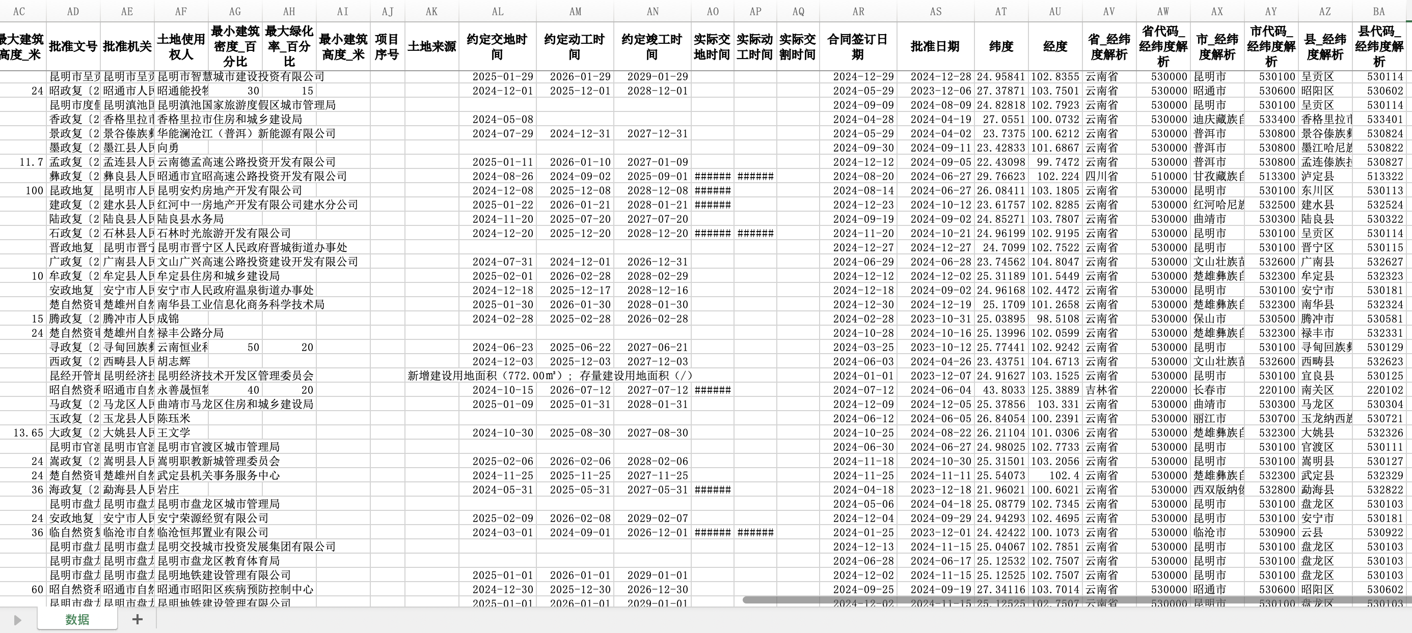 完整字段包括:年份、最小绿化率_百分比、供地全局唯一标志符、最大建筑高度_米、宗地全局唯一标志符、批准文号、省、批准机关、省代码、土地使用权人、市、最小建筑密度_百分比、市代码、最大绿化率_百分比、县、最小建筑高度_米、县代码、项目序号、行政区划代码、土地来源、编号、约定交地时间、电子监管号、约定动工时间、项目名称、约定竣工时间、行业分类、实际交地时间、土地级别、实际动工时间、宗地编号、实际交割时间、土地坐落、合同签订日期、供地方式、批准日期、供地面积_公顷、纬度、土地用途、经度、出让年限、省_经纬度解析、成交价格_万元、省代码_经纬度解析、投资强度_万元每公顷、建筑面积_公顷、市_经纬度解析、市代码_经纬度解析、最大建筑密度_百分比、县_经纬度解析、县代码_经纬度解析、最小容积率、最大容积率。