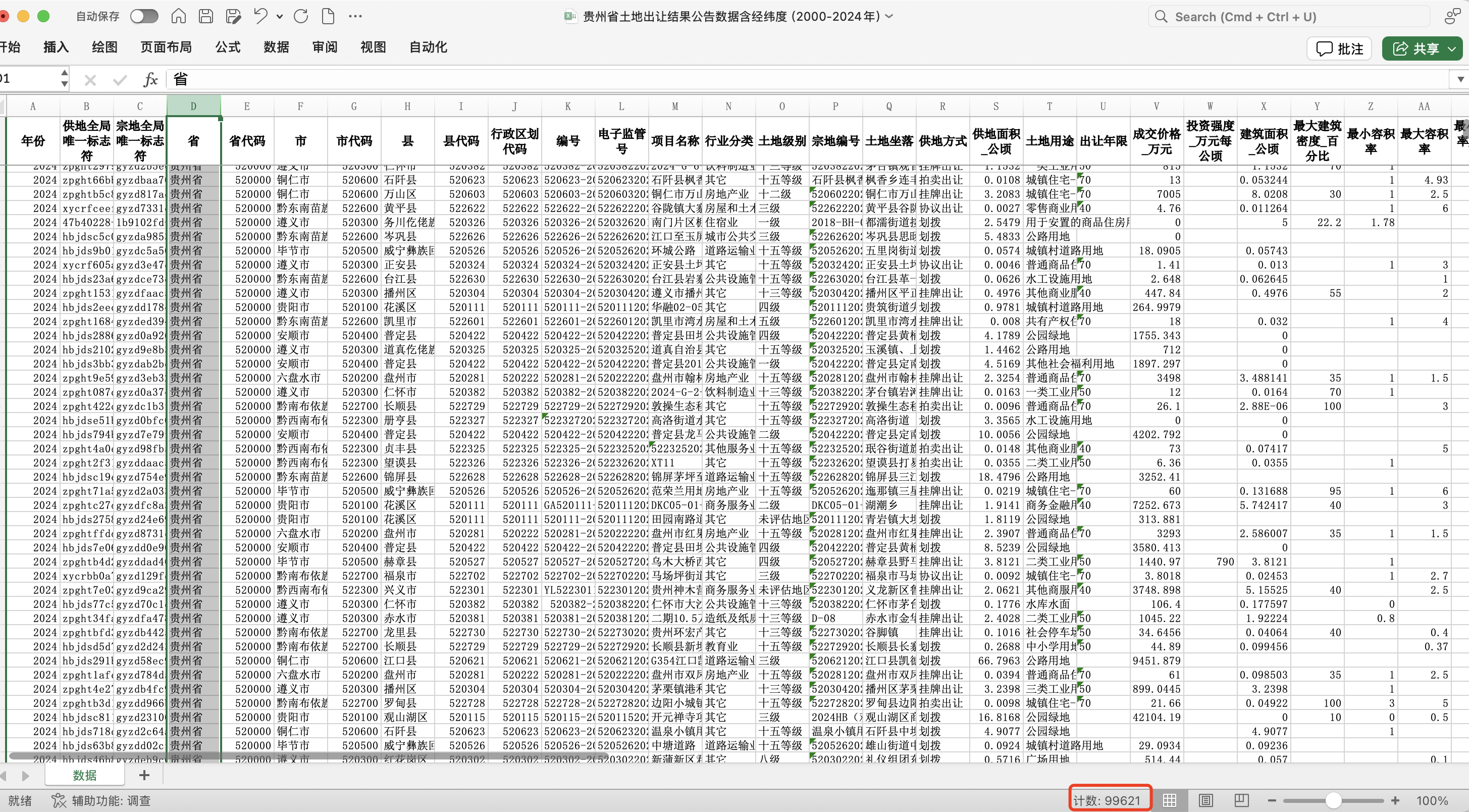 贵州省土地出让结果公告数据贵州省土地出让地块交易明细(2000-2024年,含经纬度)