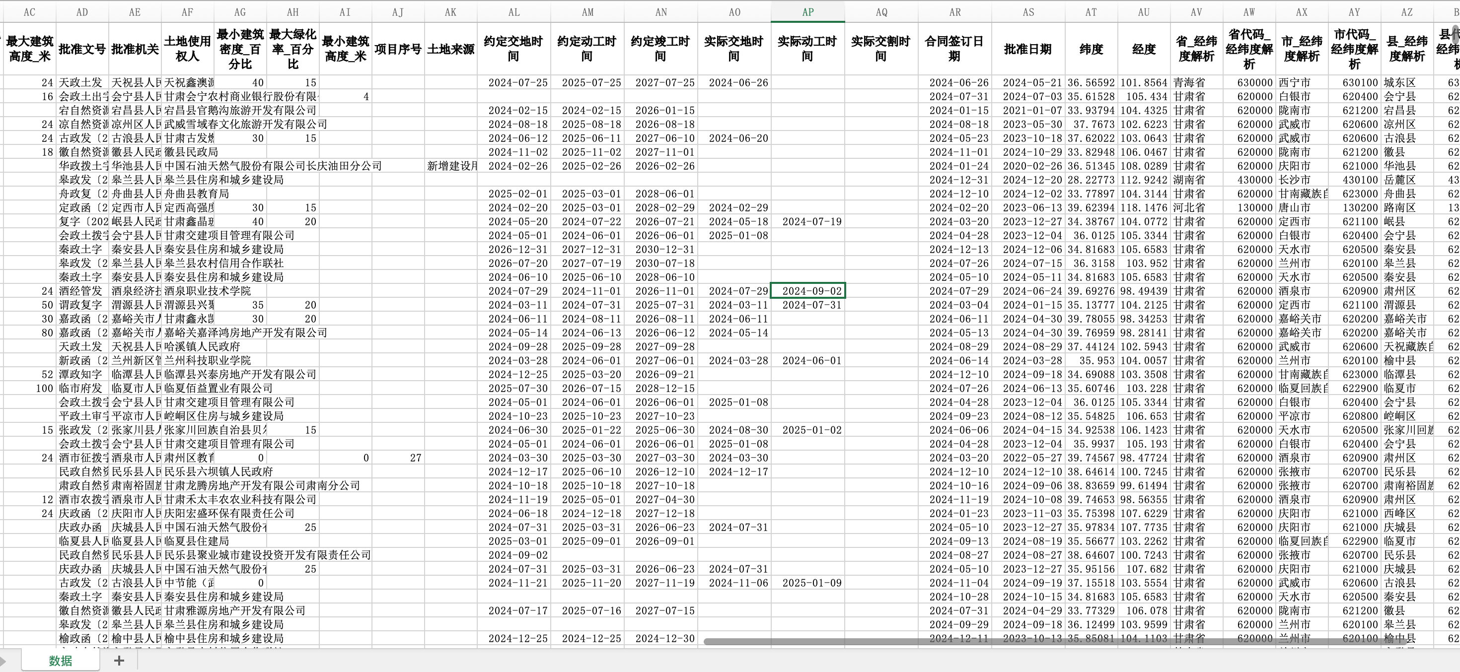 完整字段包括:年份、最小绿化率_百分比、供地全局唯一标志符、最大建筑高度_米、宗地全局唯一标志符、批准文号、省、批准机关、省代码、土地使用权人、市、最小建筑密度_百分比、市代码、最大绿化率_百分比、县、最小建筑高度_米、县代码、项目序号、行政区划代码、土地来源、编号、约定交地时间、电子监管号、约定动工时间、项目名称、约定竣工时间、行业分类、实际交地时间、土地级别、实际动工时间、宗地编号、实际交割时间、土地坐落、合同签订日期、供地方式、批准日期、供地面积_公顷、纬度、土地用途、经度、出让年限、省_经纬度解析、成交价格_万元、省代码_经纬度解析、投资强度_万元每公顷、建筑面积_公顷、市_经纬度解析、市代码_经纬度解析、最大建筑密度_百分比、县_经纬度解析、县代码_经纬度解析、最小容积率、最大容积率。