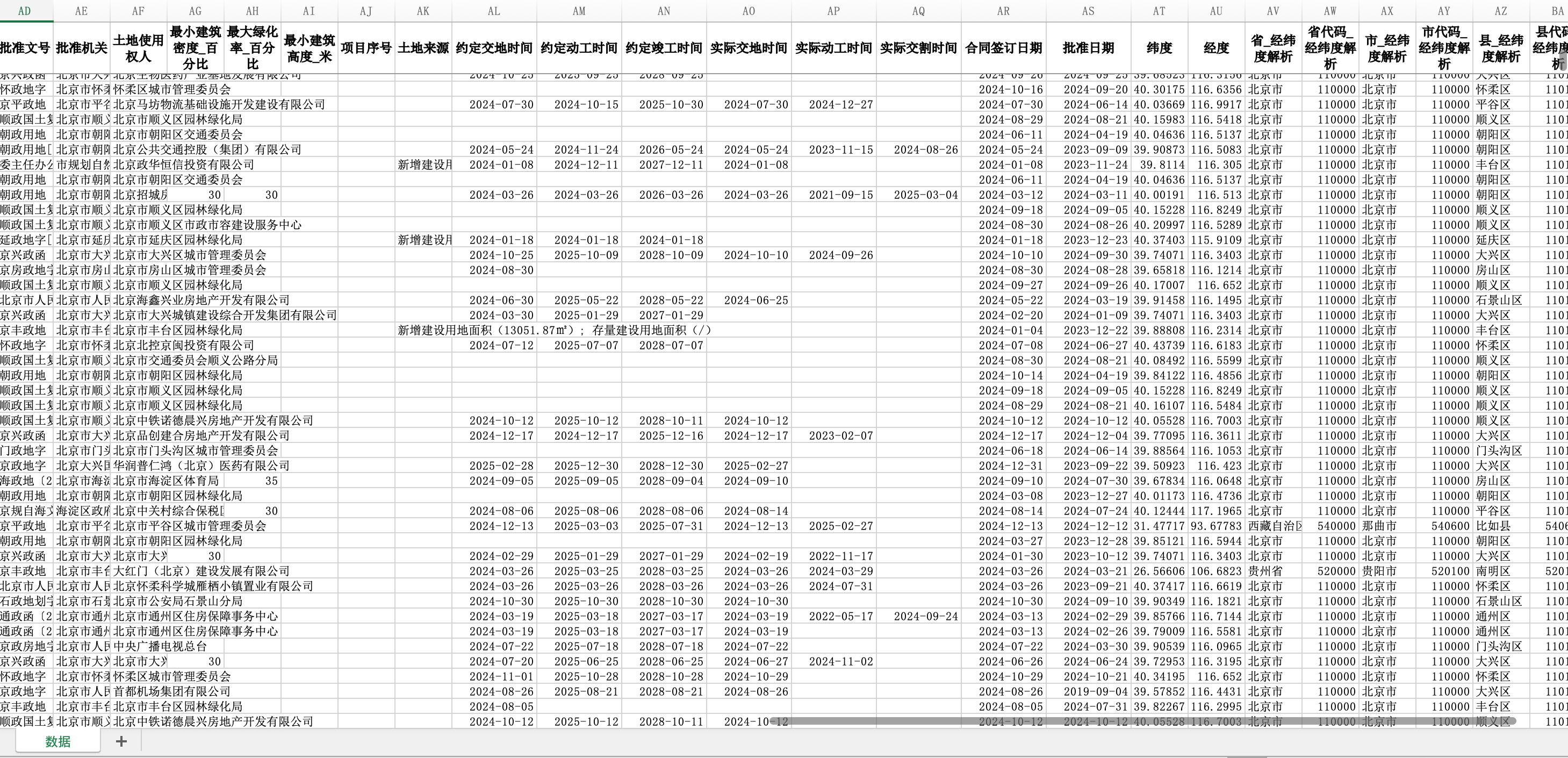 完整字段包括:年份、最小绿化率_百分比、供地全局唯一标志符、最大建筑高度_米、宗地全局唯一标志符、批准文号、省、批准机关、省代码、土地使用权人、市、最小建筑密度_百分比、市代码、最大绿化率_百分比、县、最小建筑高度_米、县代码、项目序号、行政区划代码、土地来源、编号、约定交地时间、电子监管号、约定动工时间、项目名称、约定竣工时间、行业分类、实际交地时间、土地级别、实际动工时间、宗地编号、实际交割时间、土地坐落、合同签订日期、供地方式、批准日期、供地面积_公顷、纬度、土地用途、经度、出让年限、省_经纬度解析、成交价格_万元、省代码_经纬度解析、投资强度_万元每公顷、建筑面积_公顷、市_经纬度解析、市代码_经纬度解析、最大建筑密度_百分比、县_经纬度解析、县代码_经纬度解析、最小容积率、最大容积率。