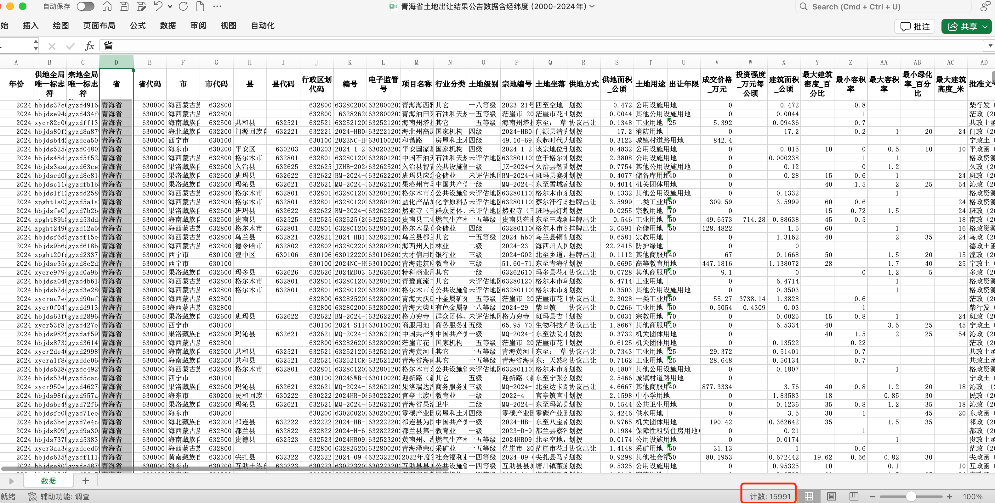 青海省土地出让结果公告数据青海省土地出让地块交易明细(2000-2024年,含经纬度)
