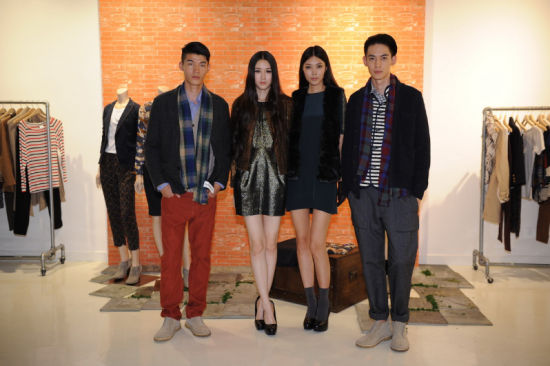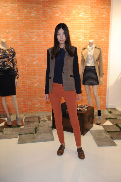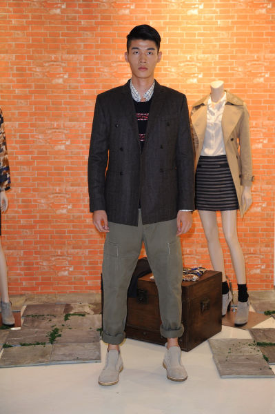 Club Monaco女郎以慵懒时尚风格诠释传统学院造型,迎接微凉初秋。系列以鲜艳的黄绿色为主,浅蓝刷白牛仔裤则成为造型基本服饰。天气渐凉,她换上了印有米黄、鲜红和深蓝色彩方块和民族图案的新装,外面披上褶襉西装外套、军服风格的连帽雪褛和菱纹配饰,洋溢浓浓秋意。配饰以怀旧为题,带来了仿旧长项链、丝质围巾和棕褐色手提包。