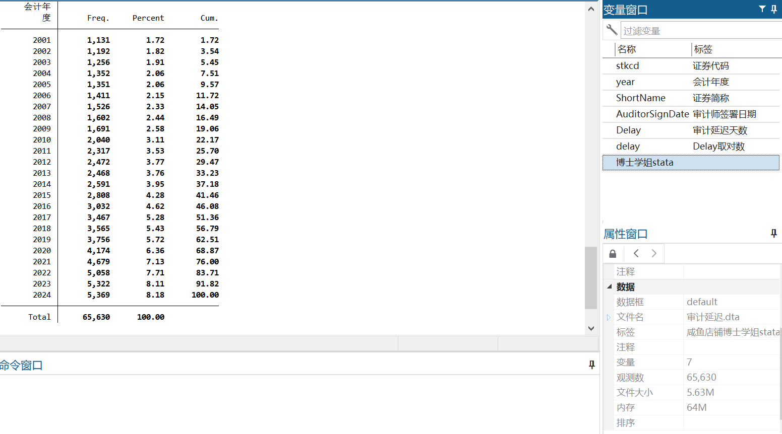 01、数据介绍审计延迟天数,从财政年度末到审计报告签署⽇期。该数值越⼤,代表审计师越努⼒作为机制,提⾼审计定价和审计费⽤。