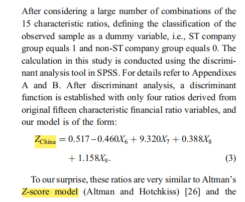 - Z-score=0.517-0.46x(负债总额/资产总额)+0.388x(营运资金/资产总额)+ 9.32x (净利润/资产总额)+1.158x(留存收益/资产总额)