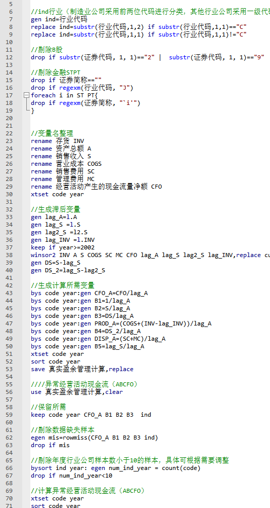 - 字段包含是否ST、PT的虚拟变量(以当年是否ST、*ST或PT为判断标准),本文剔除ST、*ST或PT类股票,如果不需要可以把对应代码删掉即可。