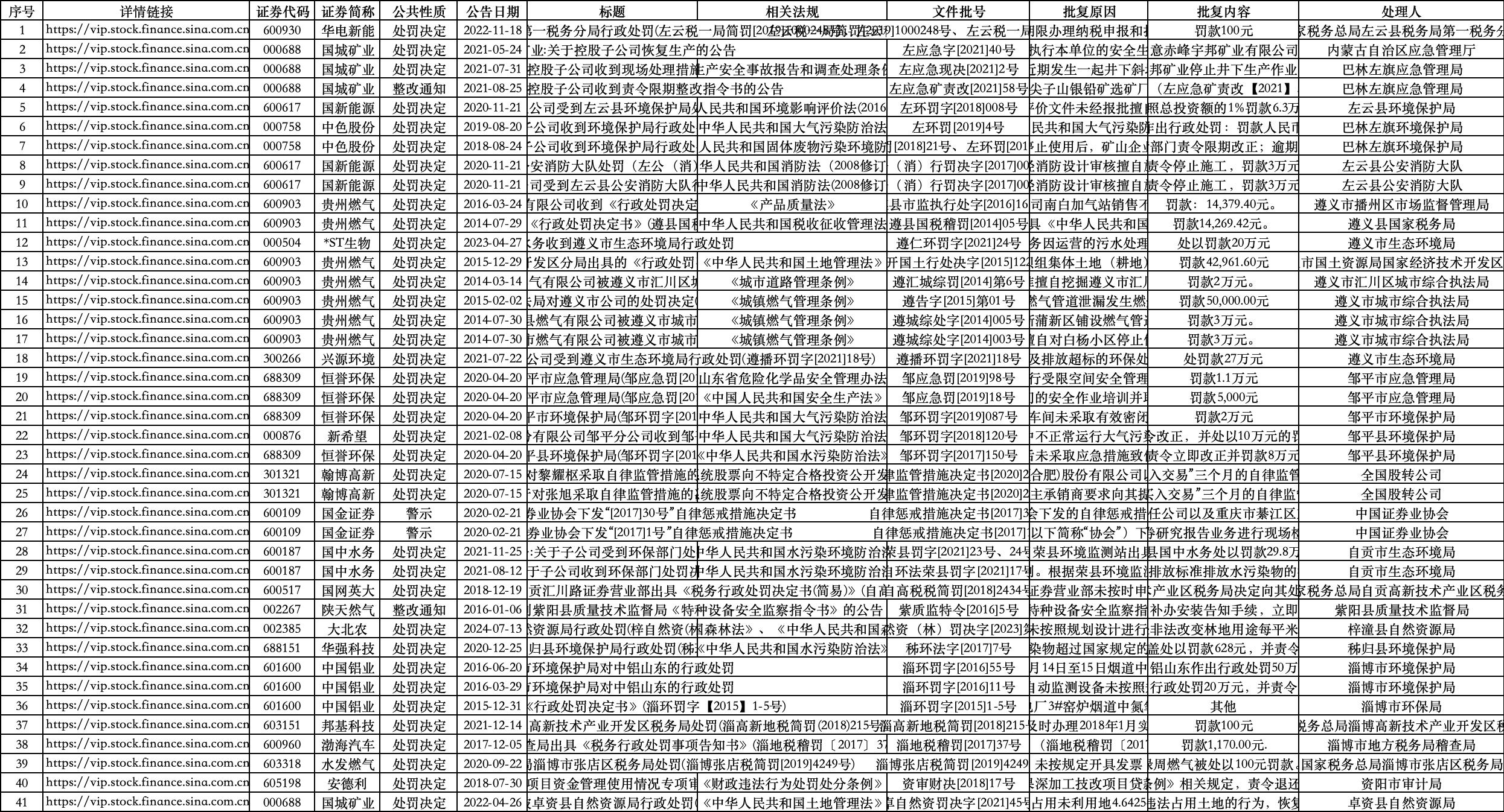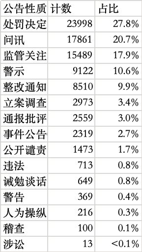 5.数据标签:证券名称、证券代码、公告日期、公告性质(包含处罚决定、问讯、监管关注、警示、整改通知、立案调查、通报批评、事件公告(非处罚结果)、公开谴责、违法、诫勉谈话、警告、人为操纵、稽查、涉讼等)、公告标题、详情页链接、相关法规、文件批号、批复原因、批复内容、处理人