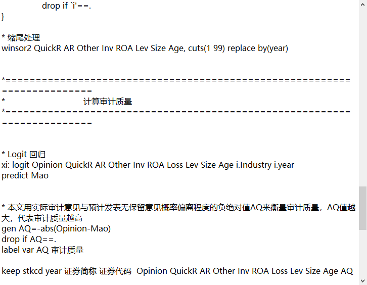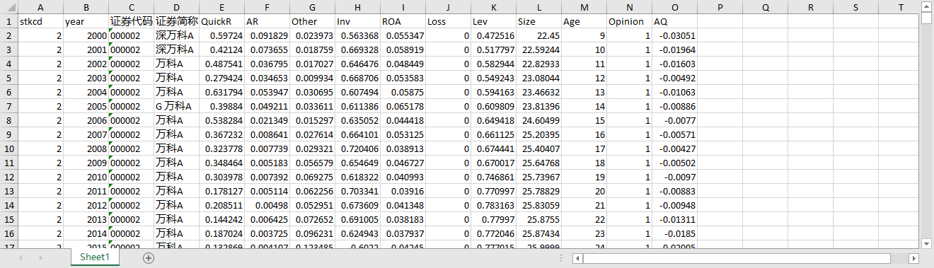 stkcd year 证券代码 证券简称 QuickR AR Other Inv ROA Loss Lev Size Age Opinion AQ
