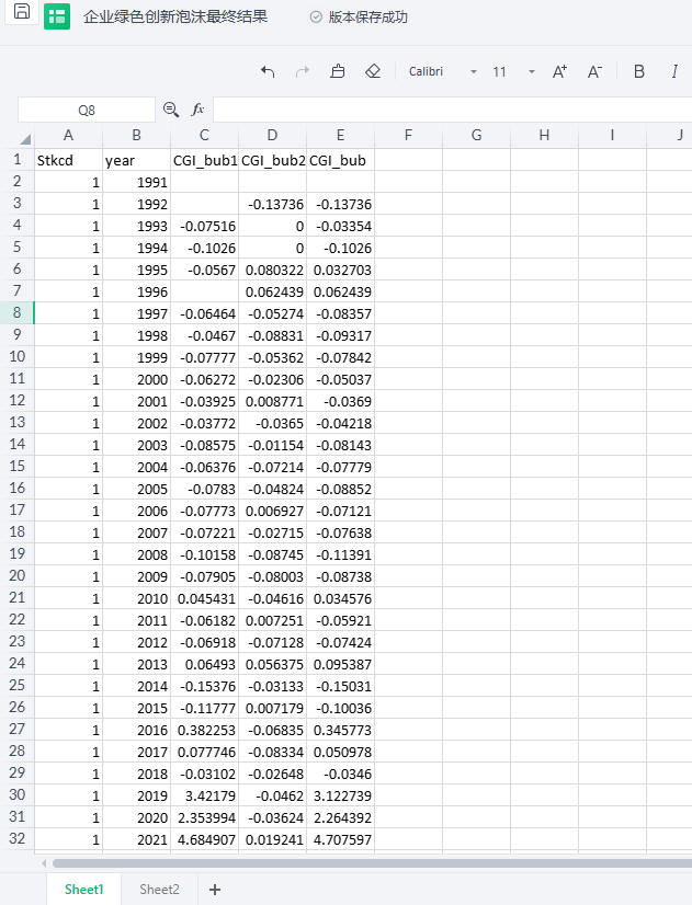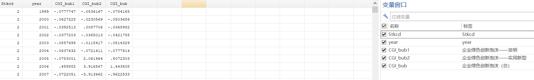 测算方式:参考顶刊SSCI《International Review of Financial Analysis》Geng(2024)老师的做法,本研究选择绿色专利授权数量作为绿色创新质量的代理变量。然而,专利数量的爆炸式增长并不能代表专利质量的实际提高,这会产生许多“专利泡沫” (Tao et al., 2021)。因此,本文计算绿色专利数量和质量之间的差异,并将该差异标准化以衡量公司绿色创新泡沫。该指标越大,公司绿色创新泡沫越严重。公司绿色创新泡沫 (CGI_bub)为最终计算结果,具体如下图所示。