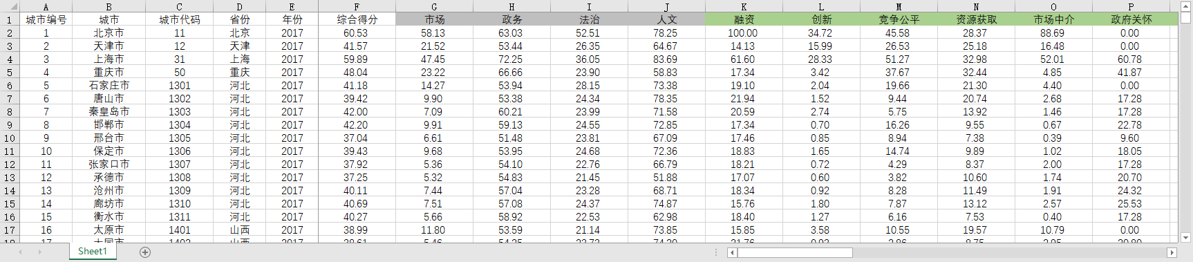 城市编号 城市 城市代码 省份 年份 综合得分 市场 政务 法治 人文 融资 创新 竞争公平 资源获取 市场中介 政府关怀 政府效率 政府廉洁 政府透明 产权保护 社会治安 司法服务 对外开放 社会信用 融资水平 专利数量 研发投入 企业品牌设立 创业企业数量 供水 电力供应 土地供应 人力资本 网络 交通服务 租赁及商业服务业企业 政府关怀度 政府规模 电子政务水平 政府廉洁度 罚没收入比 专利纠纷行政裁决 万人刑事案件 律所 贸易依存度 外资企业比 合同纠纷