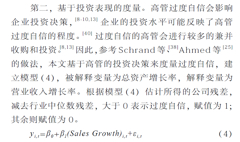 高管过度自信会影响企业投资决策,企业的投资水平可能反映了高管过度自信的程度。过度自信的高管会进行较多的兼并收购和投资。因此,参考Schrand等、lAhmed等的做法,本文基于高管的投资决策来度量过度自信,建立模型(4),被解释变量为总资产增长率,解释变量为营业收入增长率。根据模型(4)估计所得的公司残差减去行业中位数残差,大于0表示过度自信,赋值为1:其余则赋值为 0。
