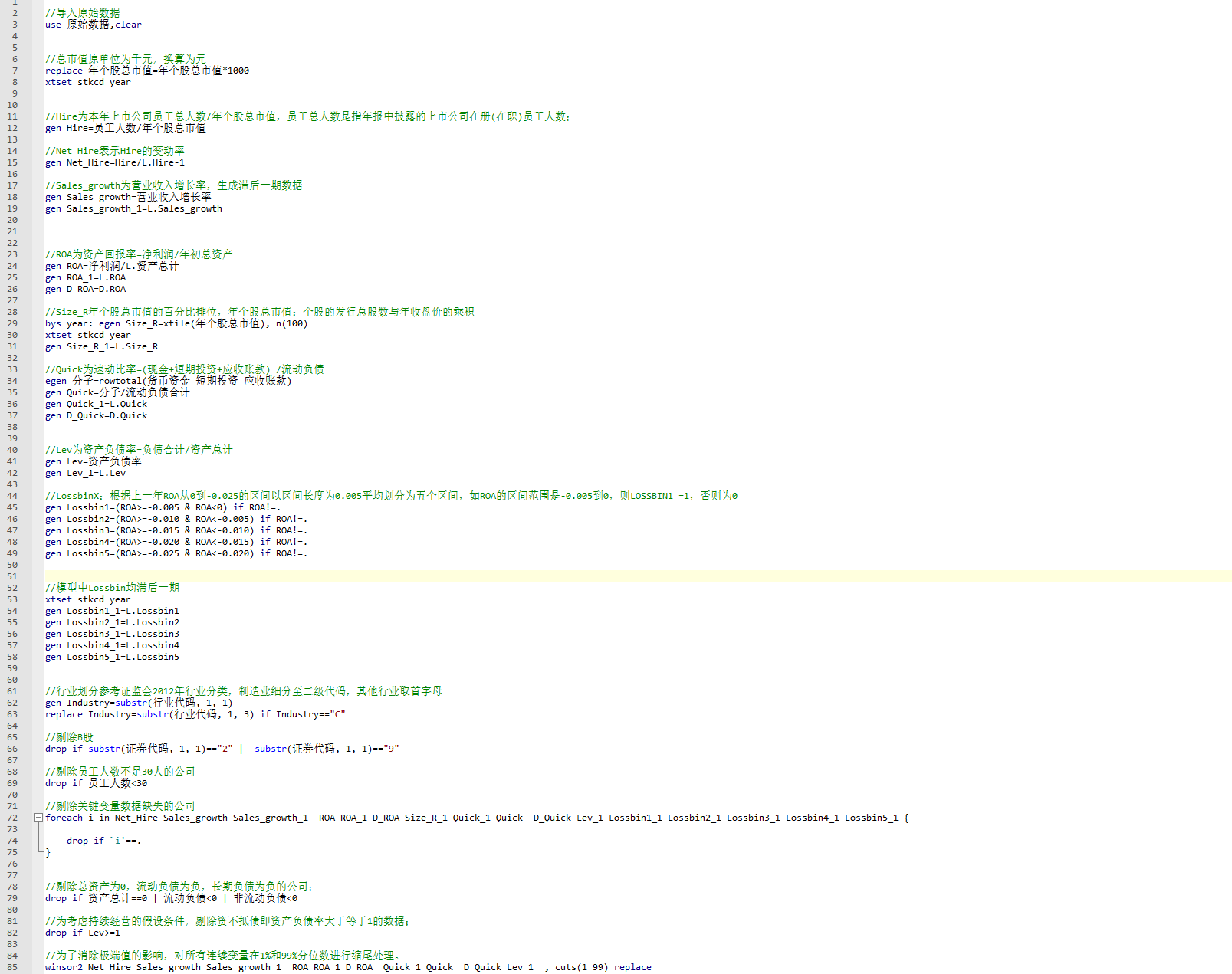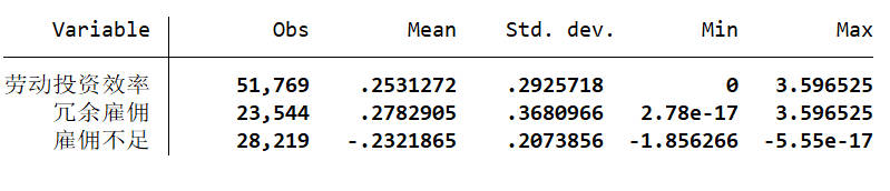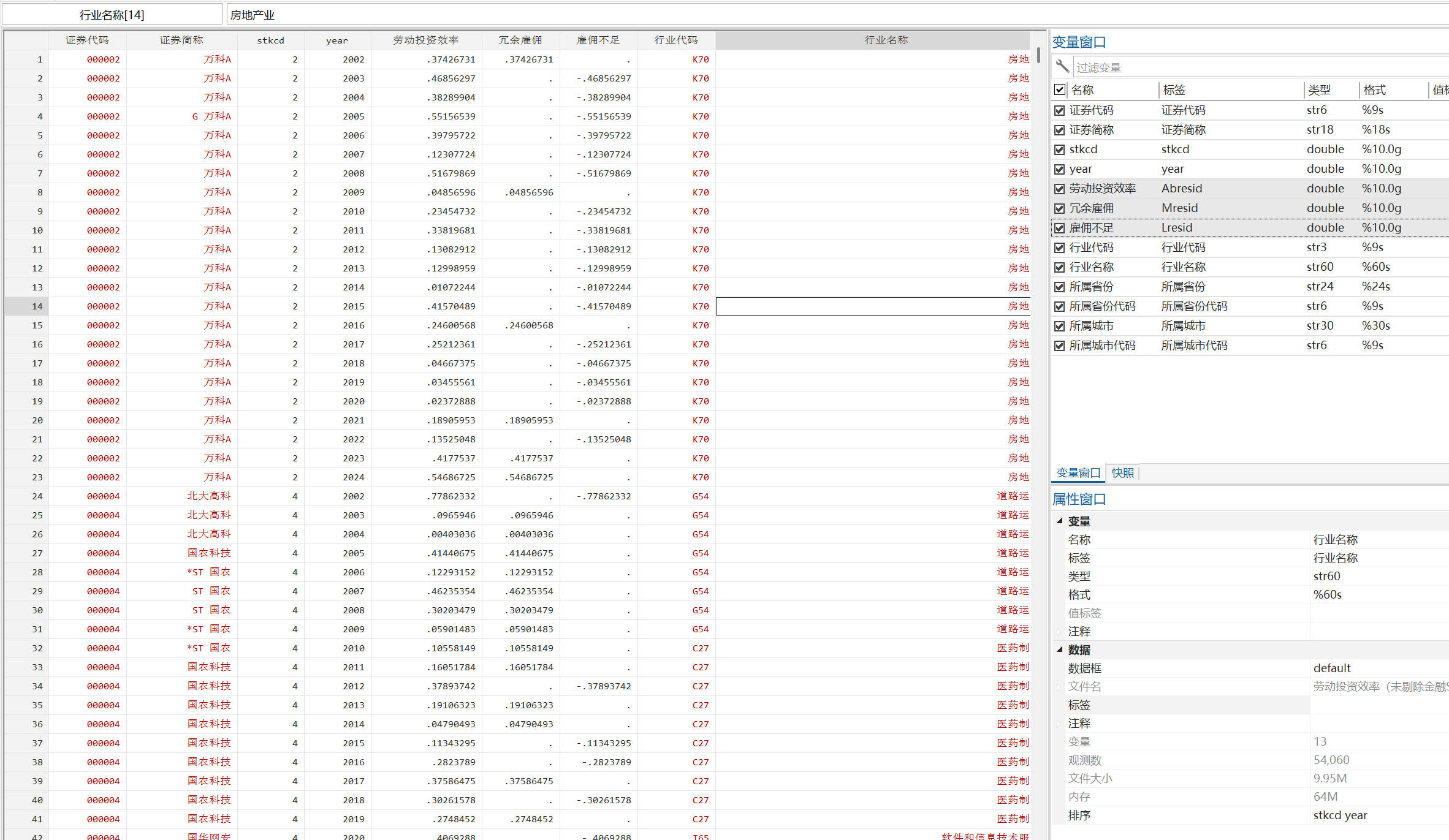 用企业的雇佣员工数量变动百分比来衡量企业的净雇佣量,然后按照雇佣员工变动率对其他几个相关的经济变量在固定行业效应后进行回归。回归后得到非正常劳动投资效率的序列