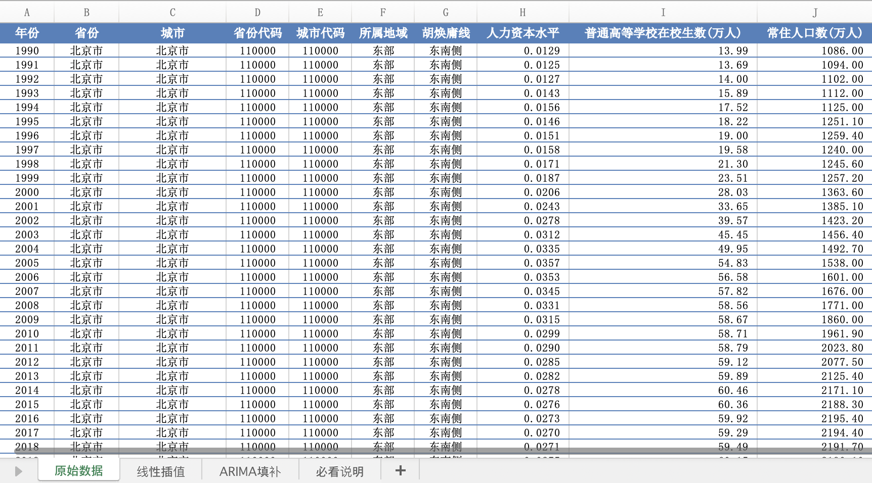全国地级市人力资本测算数据普通高校在校生数常住人口数(1990–2024年,含填补版本、胡焕庸线标记)