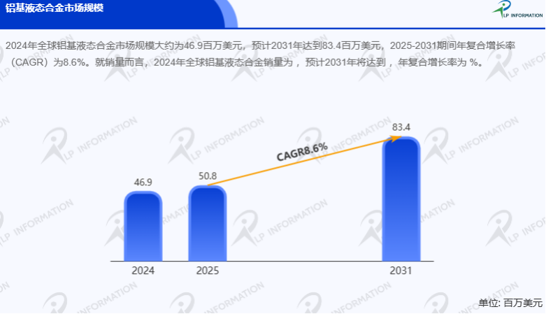 根据全球领先行业信息出版商LP Information(路亿市场策略)最新调研报告显示,2024年全球铝基液态合金市场规模大约为46.9百万美元,预计2031年达到83.4百万美元,2025-2031期间年复合增长率(CAGR)为8.6%。