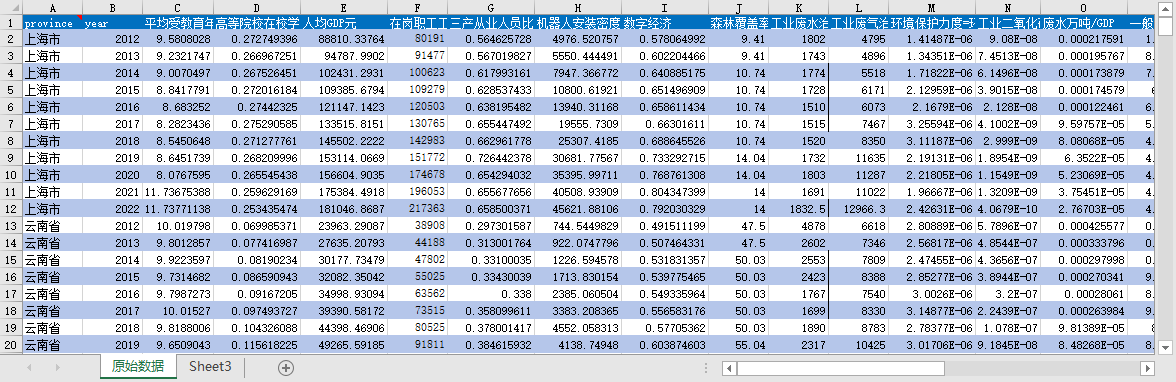 province year 平均受教育年限 高等院校在校学生结构 人均GDP元 在岗职工工资:元 三产从业人员比重 机器人安装密度 数字经济 森林覆盖率森林面积土地面积 工业废水治理设施 工业废气治理设施 环境保护力度=环保支出/一般财政支出 工业二氧化硫万吨/GDP 废水万吨/GDP 一般工业固体废弃物万吨/GDP 创业活跃度:百人新创企业数 技术市场交易额 公路里程 铁路里程 光缆线路长度 人均宽带接入端口数 单位能源消耗 可再生能源消耗:水力、风力、太阳能发电 人均专利数量 R&D投入 企业数字化