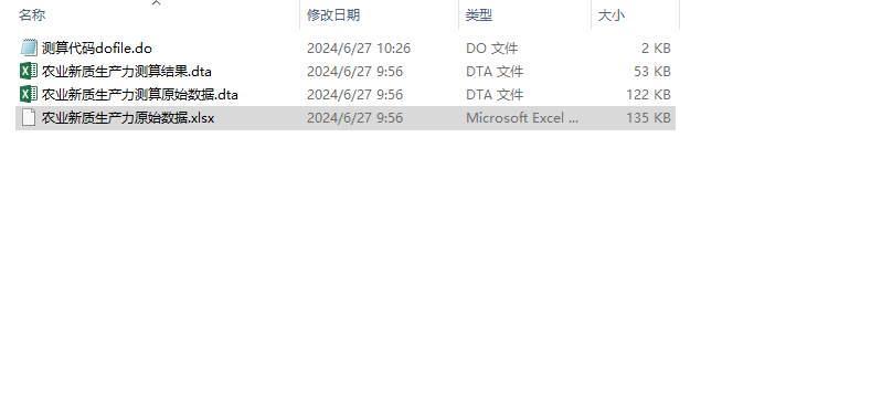 三、数据文件农业新质生产力原始数据.xlsx; 农业新质生产力测算原始数据.dta; 农业新质生产力测算结果.dta; 测算代码dofile.do