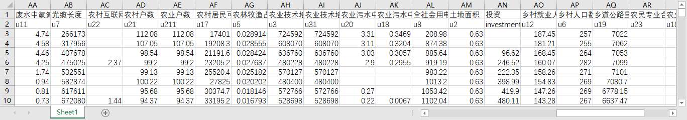 二、指标说明农业新质生产力指标主要包括:地区、年份、农村平均受教育程度、农业技术培训比例、第一产业人均产值、农村居民可支配收入、农村劳动力流动、森林覆盖率、环保支出占比、cod/第一、氨氮/第一、农、林、牧、渔服务业产值、传统基础设施、数字基础设施1、数字基础设施2、农村人均用电量、农业科技从业人员数、农业科技投入、投资插补、支付、COD、R&D经费、RD人员、第一产业就业人员、一第一产业增加值、废水中氨氮排放量万吨、光缆长度、农村互联网接入户数、农村户数、农业户数(插值)、农村居民可支配收入.1、农林牧渔占GDP比重、农业技术培训结业、农业技术培训插值、农业污水中cod、农业污水中的氨氮排放量、全社会用电量、土地面积、投资、乡村就业人员万人、乡村人口数万人、乡道公路里程数、农民专业合作社法人单位数、农业污水中氨氮排放量(插值)、节能环保支出、外出务工劳动力(万人)、能源消耗量、一般公共预算支出等