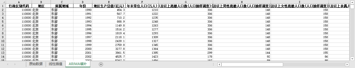 ARIMA填补。基于ARIMA模型,利用同一地区的时间序列数据,对缺失值进行预测填补。