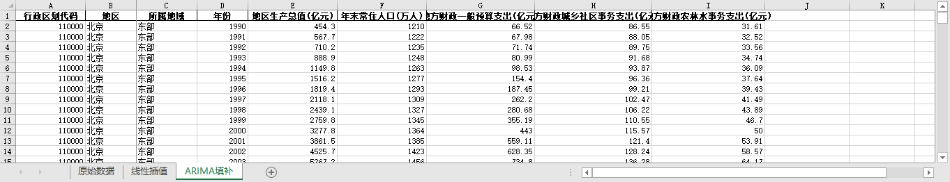 ARIMA填补。基于ARIMA模型,利用同一地区的时间序列数据,对缺失值进行预测填补。