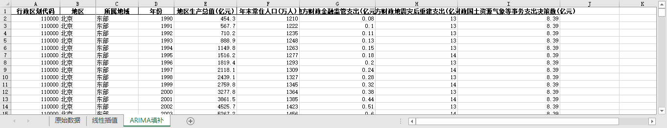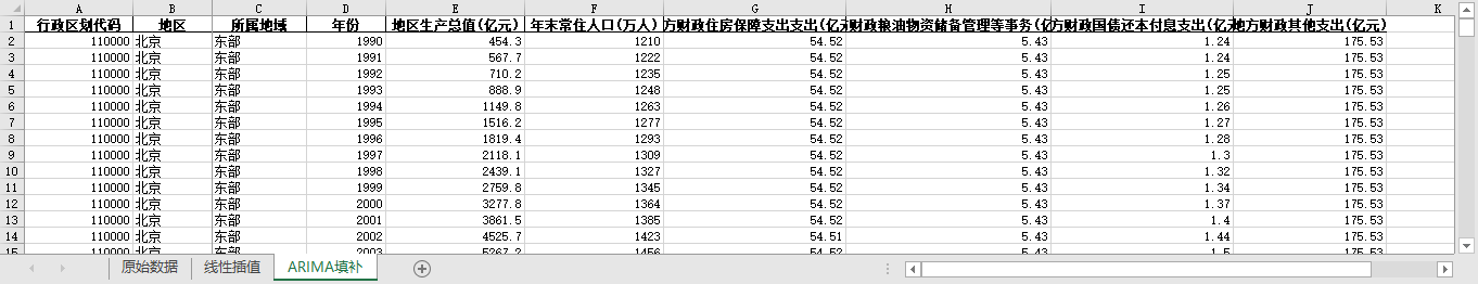 ARIMA填补。基于ARIMA模型,利用同一地区的时间序列数据,对缺失值进行预测填补。