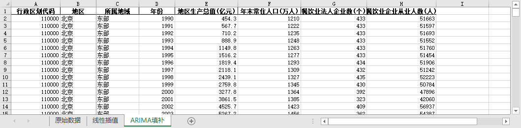 ARIMA填补。基于ARIMA模型,利用同一地区的时间序列数据,对缺失值进行预测填补。