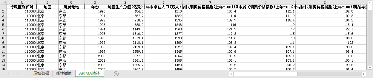 ARIMA填补。基于ARIMA模型,利用同一地区的时间序列数据,对缺失值进行预测填补。