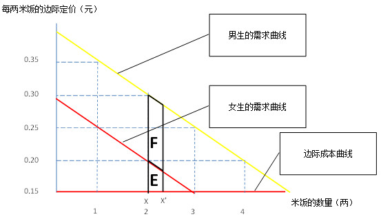 这是基于男生女生饭量的双重价格歧视。对于女生来说,买一两饭0.25元,而第二两只要0.20元,鼓励女生多买一两饭,至于吃三两以上的女生,则归入男生消费群体记。对于大多数男生来说,显然二两饭是吃不饱的,第三两饭即使贵一点也得买(0.25元)。但是食堂又引诱着你继续购买更为便宜的第四两饭,仅售0.20元,立即节省20%。于是,通过波动的边际价格,食堂对男生女生不同饭量分别运用了价格歧视,实现了利润扩大。