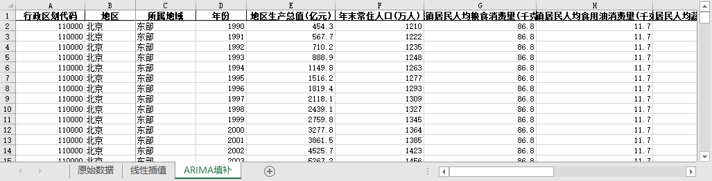ARIMA填补。基于ARIMA模型,利用同一地区的时间序列数据,对缺失值进行预测填补。