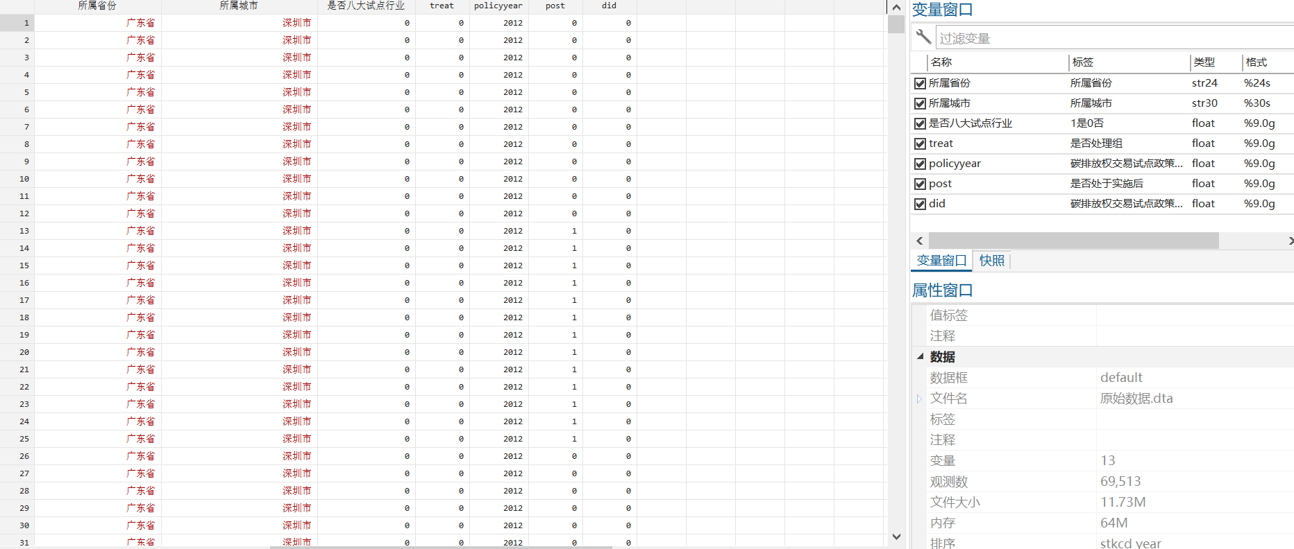 测量方法:2013年各试点才陆续开始试行碳排放权交易,但是政策正式批准的时间为2011年10月,由于企业的行为决策存在一定的前瞻性,不能排除企业在2012年的时候就做出相应的反应,因此将2012年作为政策冲击年份。