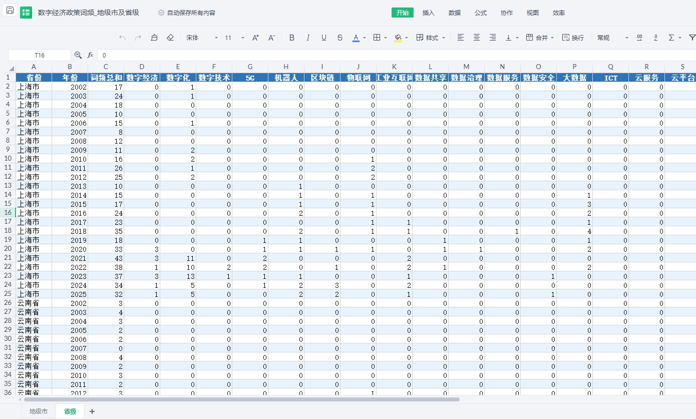 关键词: 数字经济政策词汇:数字经济、数字化、数字技术、5G、机器人、区块链、物联网、工业互联网、数据共享、数据治理、数据服务、数据安全、大数据、所属省份、ICT、云服务、云平台、上云、云计算、智慧城市、智慧化、智能化、智能制造、数字生活、信息技术、信息基础设施、软件、信息产业、线上、移动支付、电子政务、文本总字数、通信基础设施、云端、云技术、数据资产化、数字产业化、产业数字化、数据化、电商、人工智能、数字基础设施、电子商务、数字产业、数字乡村、互联网、信息和通信技术、现代信息网络、数字化信息、智慧经济、知识经济、信息经济、智能 |