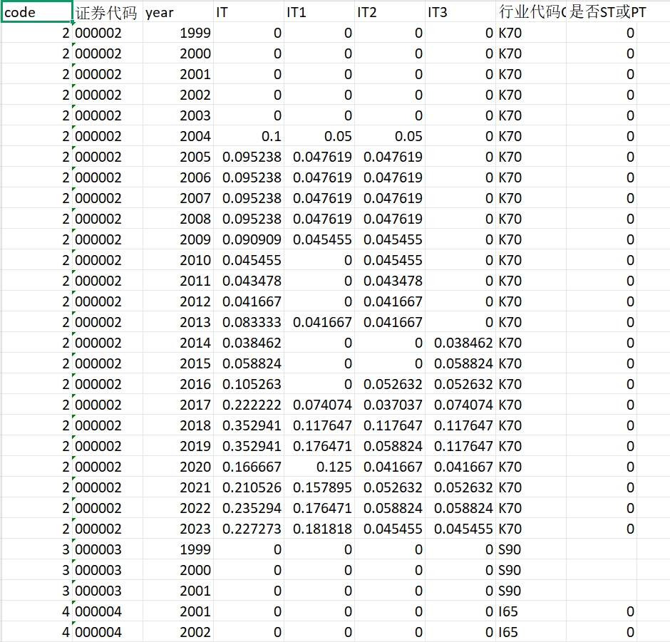 IT3:监事的信息技术背景,用上市公司拥有信息技术监事的比例来衡量,等于具有信息技术背景的监事人员数量除以监事总人数IT4:董监高人员的信息技术背景,用上市公司拥有信息技术董监高人员的比例来衡量,等于具有信息技术背景的董监高人员数量除以董监高人员总人数