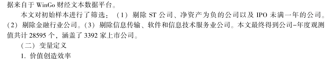 测算方式:参考顶刊《会计研究》李海彤(2024)老师的做法,本文的核心因变量是企业价值创造效率, 参考了 《中国会计指数研究报告》 的指标构建方法 (王化成等, 2023), 构建了总资产价值创造效率指标AMV, 取值为价值创造额与年末总资产之比, 其中, 价值创造额的计算方法为②: 价值创造额=净利润+支付给职工以及为职工支付的现金+应付职工薪酬本期增加额+支付的各种税费+应交税费本期增加额+财务费用。 该指标的构建理念与资产利润率等传统的企业财务绩效指标不同, 不局限于以企业为股东创造的利润水平来评价企业绩效, 而是综合地考虑企业面向整个社会的价值创造。 该理念与数字经济时代下日益彰显的共享价值创造理念有所契合 (张新民和金瑛,2022), 强调了企业应当服务于不同的利益相关者群体, 因而综合考虑了企业为股东、 员工、 政府和债权人创造的价值, 反映了企业整体的价值创造能力。