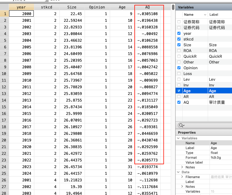审计意见(Opinion)系注册会计师就财务报表整体公允性所作的最终判断。若实际出具的审计意见与模型预测的无保留意见概率出现显著偏离,则可视作审计质量低下的信号:正向偏离意味着审计判断过度激进,易误导投资者;负向偏离则显过度保守,削弱财务报表的信息含量。为便于实证检验,本文以“预测无保留概率与实际审计意见之差”的负绝对值(AQ)度量审计质量,AQ数值越大,表明审计质量越高。