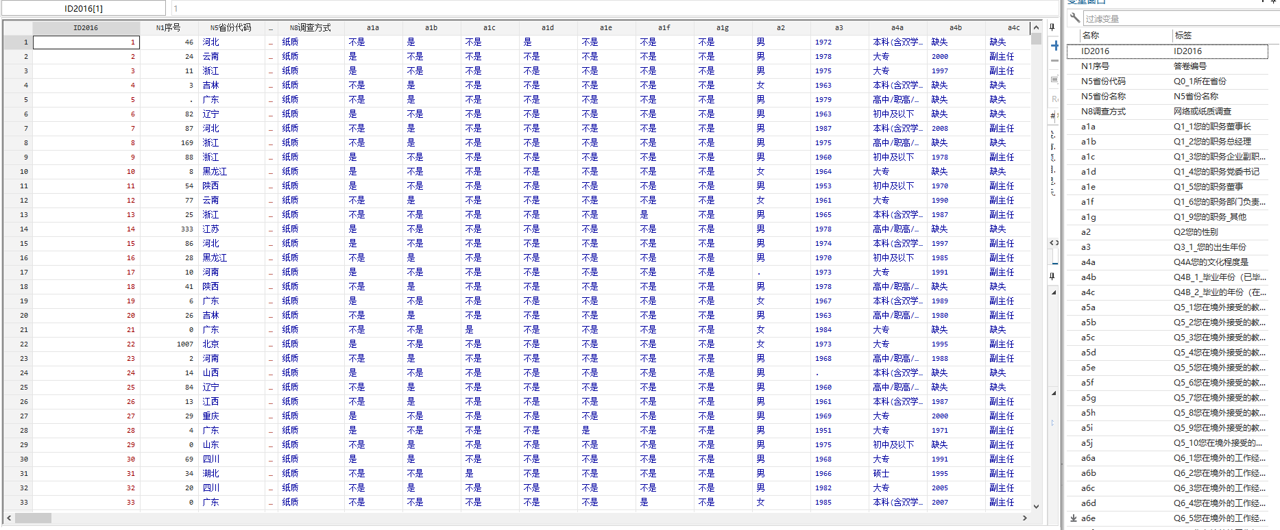 ID2016 答卷编号 Q0_1所在省份 N5省份名称 网络或纸质调查 Q1_1您的职务董事长 Q1_2您的职务总经理 Q1_3您的职务企业副职含副董事长、副总经理等 Q1_4您的职务党委书记 Q1_5您的职务董事 Q1_6您的职务部门负责人 Q1_9您的职务_其他 Q2您的性别 Q3_1_您的出生年份 Q4A您的文化程度是 Q4B_1_毕业年份(已毕业) Q4B_2_毕业的年份(在读) Q5_1您在境外接受的教育水平或经历情况是没有 Q5_2您在境外接受的教育水平或经历情况是小学及以下 Q5_3您在境外接受的教育水平或经历情况是中学 Q5_4您在境外接受的教育水平或经历情况是大学本科含双学士 Q5_5您在境外接受的教育水平或经历情况是硕士 Q5_6您在境外接受的教育水平或经历情况是博士 Q5_7您在境外接受的教育水平或经历情况是联合培养、访问学� Q5_8您在境外接受的教育水平或经历情况是博士后研究经历 Q5_9您在境外接受的教育水平或经历情况是短期培训、研修 Q5_10您在境外接受的教育水平或经历情况是其他 Q6_1您在境外的工作经历是没有 Q6_2您在境外的工作经历是境外企业全职工作 Q6_3您在境外的工作经历是境外企业兼职工作 Q6_4您在境外的工作经历是境外政府组织 Q6_5您在境外的工作经历是境外非政府组织 Q6_6您在境外的工作经历是科研、教育机构 Q6_7您在境外的工作经历是国内政府派驻机构 Q6_8您在境外的工作经历是国内国有企业境外机构 Q6_9您在境外的工作经历是国内民营境外机构 Q6_10您在境外的工作经历是其他 Q7A您是否参加了下列组织 Q7B_1_T您是中共党员哪年入党 Q7C_1_T您是民主党派成员哪年加入 Q8A_1您是否现任或曾任人大代表或政协委员 Q8B_1_您担任现任人大代表最早是哪一年开始 Q8C属于哪一级 Q8D是否在常委会任职 Q8b1_1_您担任现任政协委员最早是哪一年开始 Q8b2属于哪一级 Q8b3是否在常委会任职 Q8c1_1_您曾担任人大代表是从哪一年开始 Q8c1_2_T到哪一年 Q8c2属于哪一级 Q8c3是否在常委会任职 Q8d1_1_您曾担任政协委员是从哪一年开始 Q8d1_2_T到哪一年 Q8d2属于哪一级 Q8d3是否在常委会任职 Q9_1您认为企业家担任党代会代表人大代表政协委员主要目的� Q9_2您认为企业家担任党代会代表人大代表政协委员主要目的� Q9_3您认为企业家担任党代会代表人大代表政协委员主要目的� Q9_4您认为企业家担任党代会代表人大代表政协委员主要目的� Q9_5您认为企业家担任党代会代表人大代表政协委员主要目的� Q9_6您认为企业家担任党代会代表人大代表政协委员主要目的� Q9_7您认为企业家担任党代会代表人大代表政协委员主要目的� Q9_8您认为企业家担任党代会代表人大代表政协委员主要目的� Q10_1除您本人外,贵企业的管理人员中有没有以下人员(党政 Q10_2除您本人外,贵企业的管理人员中有没有以下人员(党政 Q10_3除您本人外,贵企业的管理人员中有没有以下人员(人大 Q10_4除您本人外,贵企业的管理人员中有没有以下人员(海外 Q11A您(企业)是不是工商联会员 Q11B您在哪一级工商联担任职务 Q11C担任什么职务 Q11D_1您是否加入了下列团体个体劳动者协会(个协) Q11D_2您是否加入了下列团体有政府背景的其他行业协会商会 Q11D_3您是否加入了下列团体青年联合会(青联) Q11D_4您是否加入了下列团体民间行业协会商会 Q11D_5您是否加入了下列团体私人董事会(私董会) Q11D_6您是否加入了下列团体MBA同学会或类似组织 Q11D_7您是否加入了下列团体慈善或公益组织 Q11D_8您是否加入了下列团体兴趣爱好类社团组织 Q12_1_T12.2015年,您个人全年总收入万元 Q13A同周围其他社会成员(人士)相比,您认为自己在经济地� Q13B同周围其他社会成员(人士)相比,您认为自己在社会地� Q13C同周围其他社会成员(人士)相比,您认为自己在政治地� Q14A_1_T您是哪一年开始从事个体私营经济活动的 Q14B_1_T您目前经营的这家企业是在哪一年登记注册的 Q14C您是不是目前这家企业的主要创办人 Q15您的企业目前注册类型是 Q16.1 2015年,您企业的第一主业 Q16.2 2015年,您企业的第二主业 Q16.3 2015年,您企业的第三主业 Q17A您的企业上市情况是 Q17B_1_如果贵企业已上市,上市时间是哪一年 Q18A_1_您目前经营的主要企业出资人和资本构成是 您自己和家 Q18A_2_您目前经营的主要企业出资人和资本构成是 国有资本, Q18A_3_您目前经营的主要企业出资人和资本构成是 外资和港澳 Q18A_4_您目前经营的主要企业出资人和资本构成是 其他,占� Q18B_1_净资产总额(万元) Q19_1_T2015年企业的用工状况全年雇用的员工有 Q19_2_T2015年企业的用工状况雇用半年以上不足一年的员工有 Q19_3_T2015年企业的用工状况半年以下临时雇用的员工有 Q19_4_T2015年企业的用工状况全年新入职员工 Q19_5_T2015年企业的用工状况离职员工 Q20_1_T2015年您企业用于员工工资、社会保险的支出有多少 全� Q20_2_T2015年您企业用于员工工资、社会保险的支出有多少 如� Q20_3_T2015年您企业用于员工工资、社会保险的支出有多少 全� Q20_4_T2015年您企业用于员工工资、社会保险的支出有多少 全� Q20_5_T2015年您企业用于员工工资、社会保险的支出有多少 全� Q20_6_T2015年您企业用于员工工资、社会保险的支出有多少 全� Q20_7_T2015年签订个人劳动合同人次 Q20_8_T2015年签订集体劳动合同人次 Q20_9您企业是否建立了住房公积金制度 Q21A_1_T2015年您企业的融资状况企业流动资金中 贷款占 Q21A_2_T2015年您企业的融