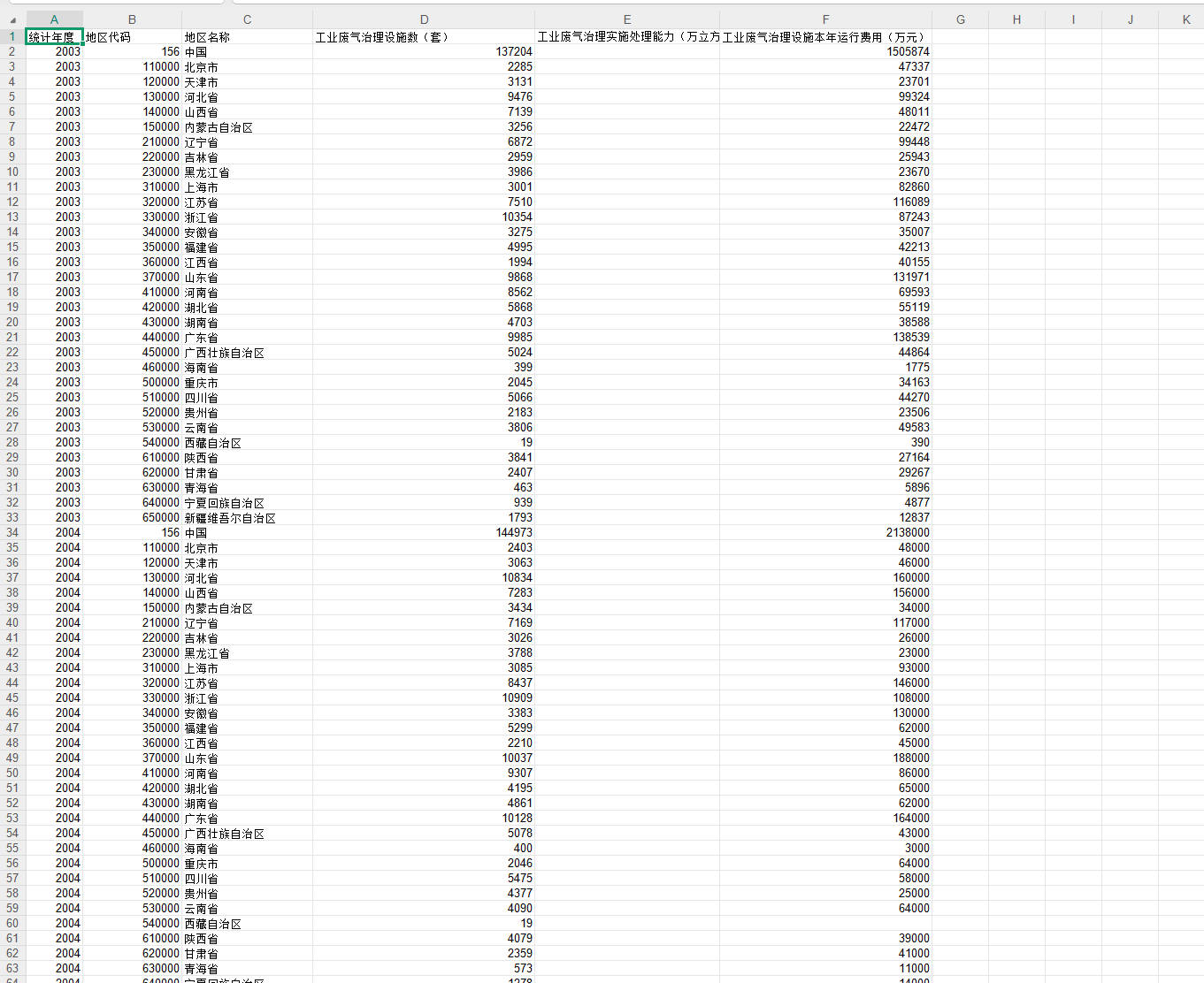 综合评价:的各地区工业废气处理投入数据(含治理设施数、实时处理能力、运行费用等)具有重要学术意义:它为环境治理绩效评估提供多维度支撑,可用于构建综合评价模型识别治理薄弱环节;是环境政策协同效应实证研究的基础,能检验政策实施效果与行政干预影响;还为区域发展与环境约束的动态平衡研究提供空间分析样本,助力探讨经济与环境协调机制。基于此,可行研究方向包括技术效率与治理模式创新(如技术经济性比较、实时处理能力动态评估)、政策工具与治理投入联动(如财政补贴激励效应、市场化机制效果)、区域差异与协同治理(如空间溢出效应、产业转移与环境责任)等,这些研究既能深化环境治理规律认知,也能为绿色转型提供政策支撑。