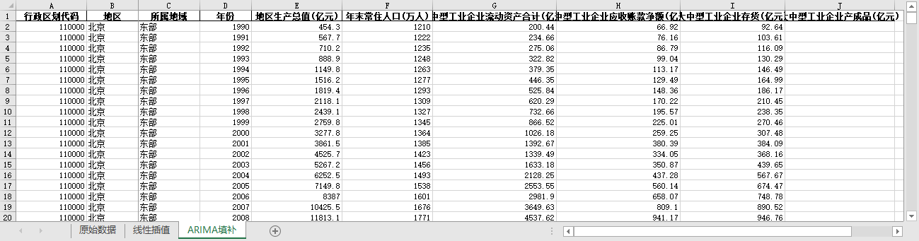 ARIMA填补。基于ARIMA模型,利用同一地区的时间序列数据,对缺失值进行预测填补。