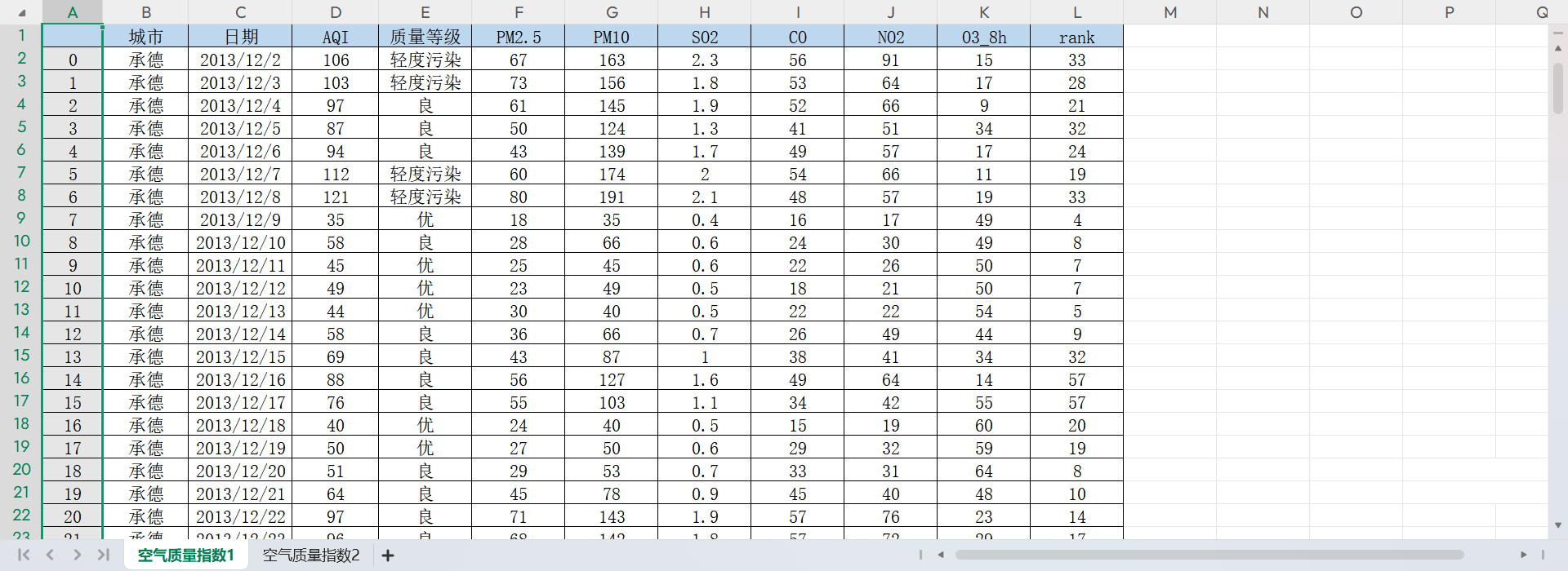 02、相关数据城市、⽇期、AQI、质量等级、PM2.5、PM10、SO2、CO、NO2、O3_8h、rank。