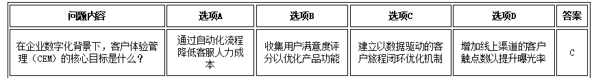 1. 正确答案C:现代客户体验管理(CEM)的核心是通过整合全渠道数据(如行为数据、反馈数据),构建客户旅程的实时监测与分析闭环,实现基于数据的持续体验优化(参考HEART模型)。