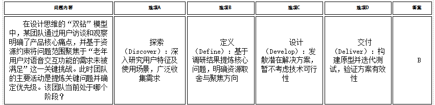 4. 选项D(交付阶段):核心是原型实现与用户测试(如A/B测试),与“问题聚焦”无关。