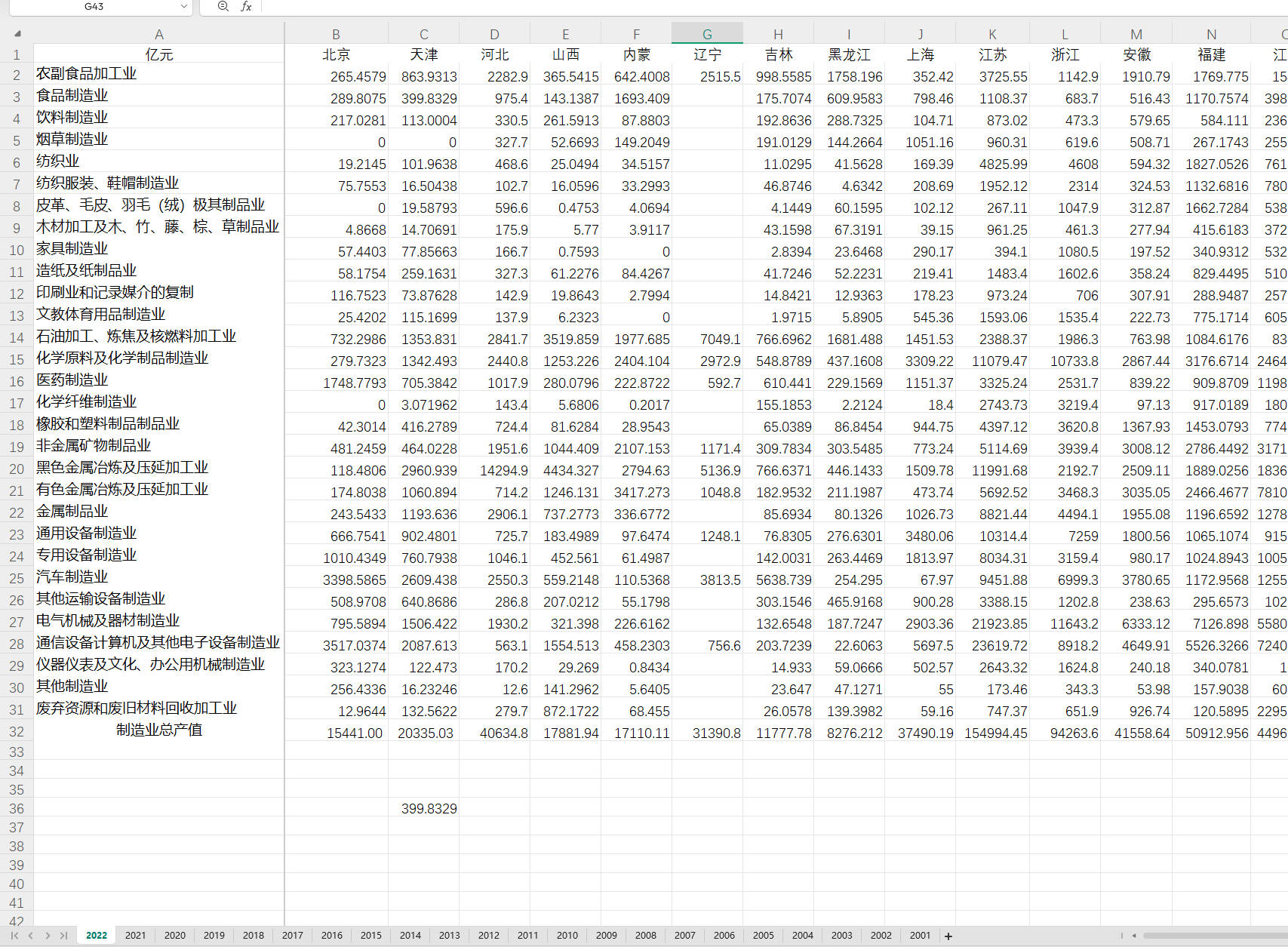 农副食品加工业;食品制造业;饮料制造业;烟草制造业;纺织业;纺织服装鞋帽制造业;皮革、毛皮、羽毛(绒)极其制品业;木材加工及木、竹、藤、棕、草制品业;家具制造业;造纸及纸制品业;印刷业和记录媒介的复制;文教体育用品制造业;石油加工、炼焦及核燃料加工业化;学原料及化学制品制造业;医药制造业;化学纤维制造业;橡胶和塑料制品制品业;非金属矿物制品业;黑色金属冶炼及压延加工业;有色金属冶炼及压延加工业;金属制品业;通用设备制造业;专用设备制造业;汽车制造业;其他运输设备制造业;电气机械及器材制造业;通信设备计算机及其他电子设备制造业;仪器仪表及文化、办公用机械制造业;其他制造业;废弃资源和废旧材料回收加工业;制造业总产值
