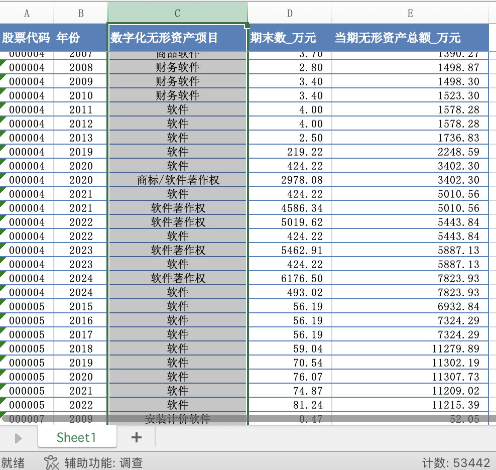 本数据旨在以“数字化无形资产占比”作为企业数字化转型强度的结构性财务指标,为研究“数字化转型与企业价值”、“数字治理与风险定价”、“审计风险识别” 等问题提供量化支撑。