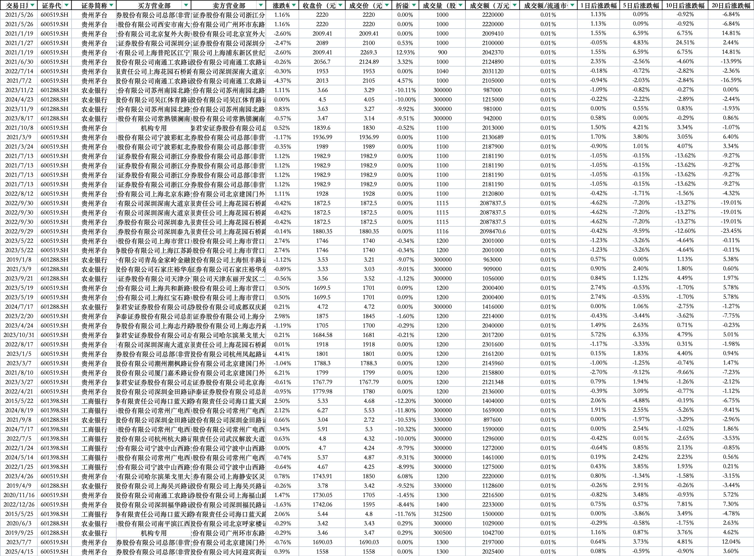 5.字段内容:序号、交易日期、证券代码、证券简称、买方营业部、卖方营业部、涨跌幅、收盘价(元)、成交价(元)、折溢率、成交量(股)、成交额(万元)、成交额/流通市值、1日后涨跌幅、5日后涨跌幅、10日后涨跌幅、20日后涨跌幅6.数据特征: