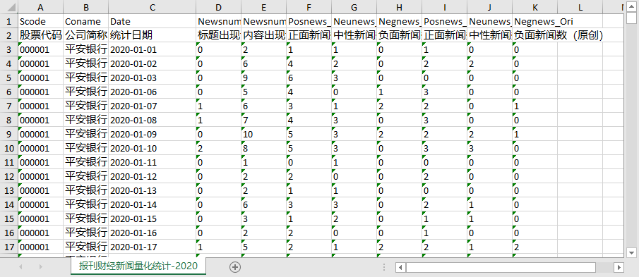 ID year 标题出现该公司的新闻总数 内容出现该公司的新闻总数 正面新闻数全部 中性新闻数全部 负面新闻数全部 正面新闻数原创 中性新闻数原创 负面新闻数原创