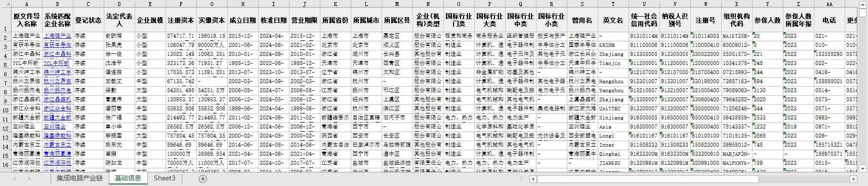 1949-2024年半导体IC集成电路产业链全国上中下游企业信息节点关联性参保人数联系电话法定代表人所属行业省份城市区县等