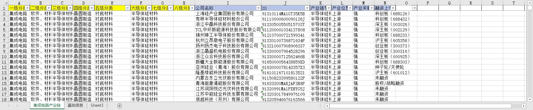 一级分类 二级分类 三级分类 四级分类 五级分类 六级分类 七级分类 八级分类 公司名称 ID 产业链节点 产业位置 产业关联性 融资上市