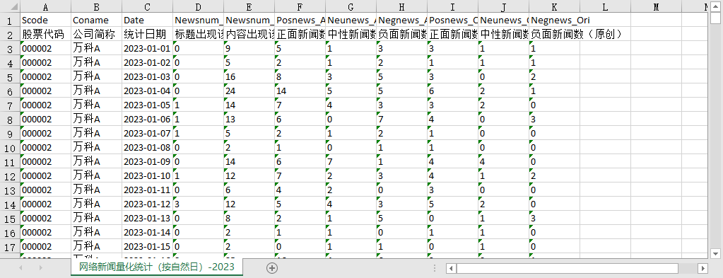 Posnews_All[正面新闻数(全部)]-一天内上市公司全部正面新闻总数,统计时段为0:00-24:00