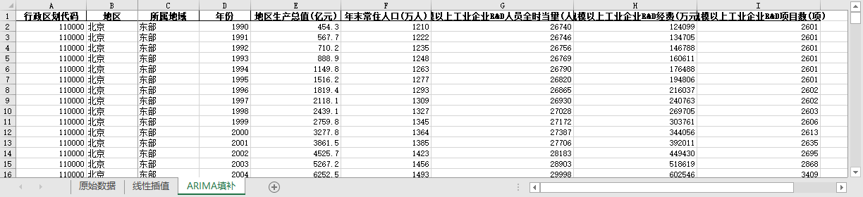 ARIMA填补。基于ARIMA模型,利用同一地区的时间序列数据,对缺失值进行预测填补。