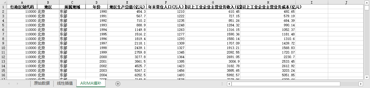 ARIMA填补。基于ARIMA模型,利用同一地区的时间序列数据,对缺失值进行预测填补。